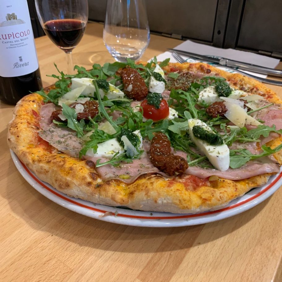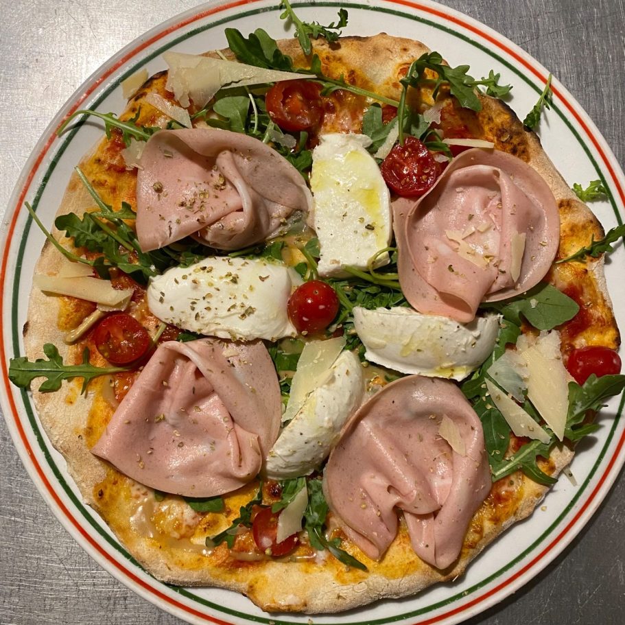 ITALIA : sauce tomate, fior di latte, jambon cru italien, burrata pugliese, salade