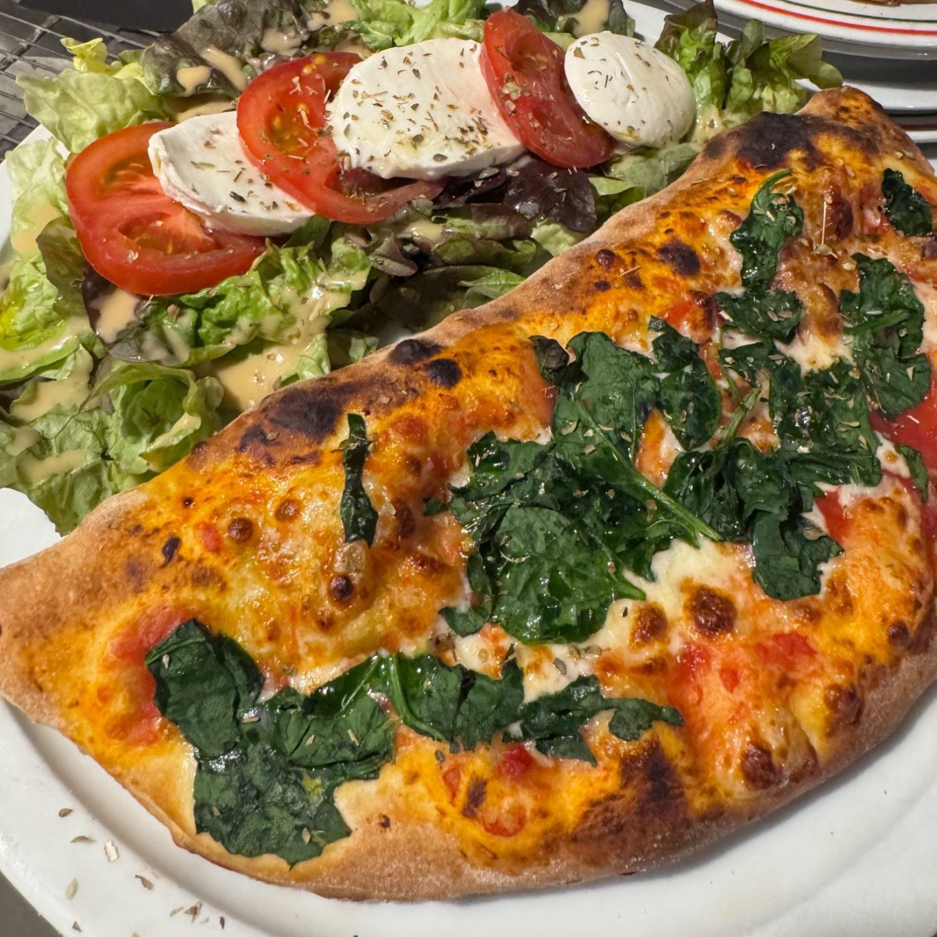 CALZONE AMORE E FANTASIA : fior di latte, tomates, gorgonzola, jambon, salade